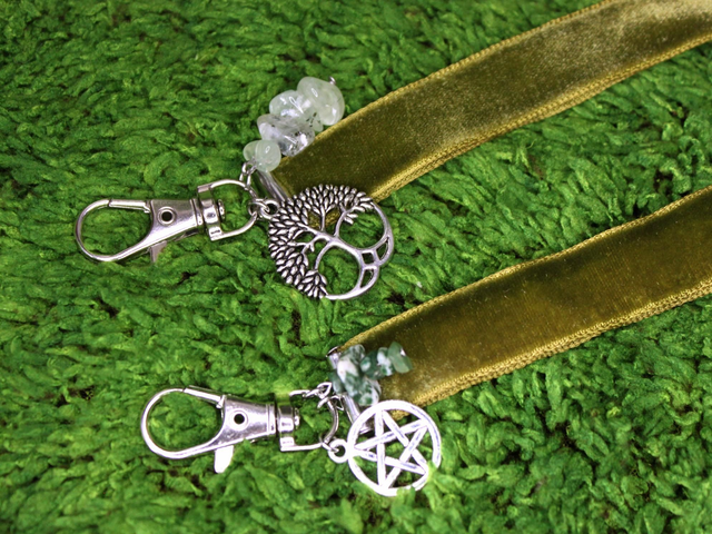 Schlüsselanhänger bestehend aus einem Karabiner (Metalllegierung), einem Anhänger (Metalllegierung), Steinsplittern (Achat) und einer grünen Samtschlaufe.