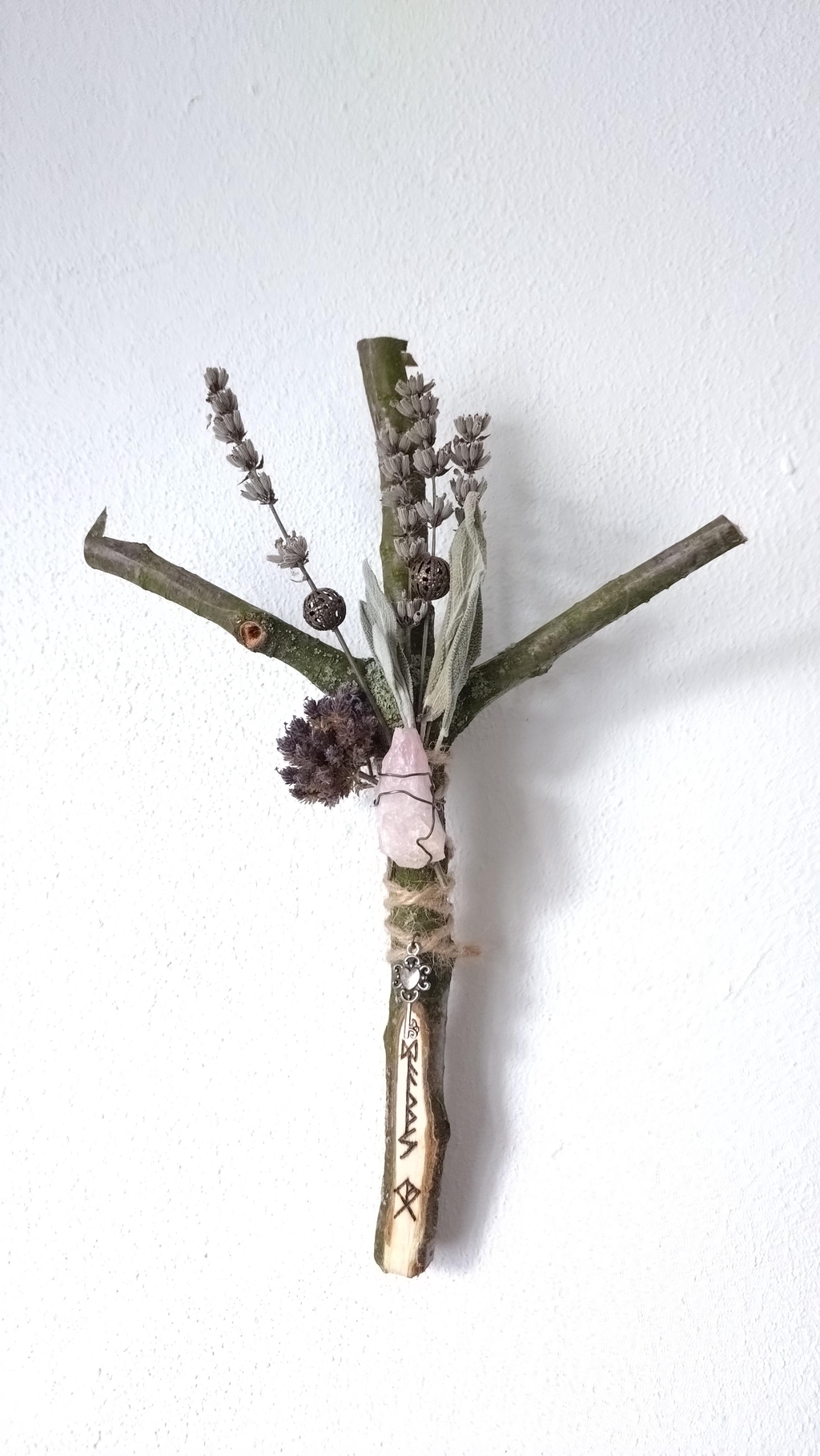 Die Basis bildet eine natürlich gewachsene Astgabel in Form der Schutzrune. Verschiedene Gehölze haben unterschiedliche spirituelle Bedeutungen, die dem Schutzbringer unterschiedliche "Kräfte" verleihen. Das Holz stammt alles aus dem eigenen Garten, genauso wie die verwendeten Pflanzenteile (Ausnahmen sind gekennzeichnet). Damit kommen wir zur Dekoration der Rune. Jede Rune ist zusätzlich mit getrockneten Pflanzenteilen, Steinen und anderen Elementen mit verschiedener Symbolik dekoriert. Die spirituellen Bedeutungen der Elemente ist oft durch verschiedenste Religionen und vergangene Völker geprägt. Ein großteil aber bezieht sich auf die nordische und germanische Mythologie.